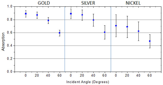 The average absorption values and the standard error deviation, as a function of the incident angle and metallic materials, are shown in Figure 8. Values of average absorption higher than 88% can be obtained.