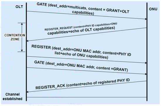 Figure 2. OLT and ONUs discovery and communication protocol. The contention zone is the period where multiple ONUs engage in competition to register with the OLT, ensuring collision avoidance.