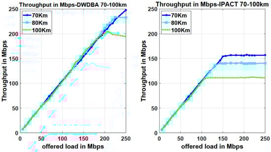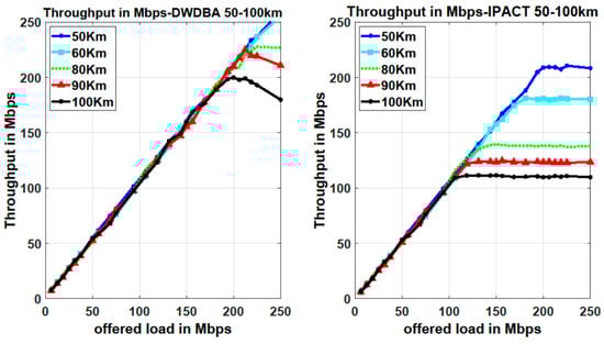 In this section, we present the results of our DWDBA algorithm together with that of the IPACT algorithm for LRPONs in terms of the throughput for the upstream link for comparison under varying offered loads. The throughput is a crucial metric that determines the efficiency and effectiveness of data transmission in the network. It is an important parameter that can be used to assess the overall performance of a network, particularly in terms of its capacity to handle a certain level of data traffic. In our simulations, the throughput metric not only takes into account the data payload, but also includes the Ethernet header and trailer.