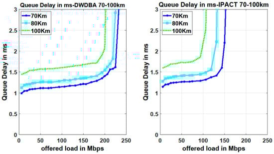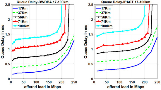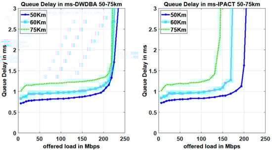 In Figure 12, the results from scenario 4, where the ONUs are positioned between 50 km and 100 km from the OLT, are presented. In Figure 12 (left), which corresponds to the DWDBA algorithm, all of the ONUs demonstrate low queue delays that are proportional to their distances from the OLT. Notably, the DWDBA algorithm enables the farther ONUs to maintain low queue delays even at higher offered loads. For instance, the ONUs are able to sustain low queue delays up to an offered load of 200 Mbps due to the fact that the DWDBA does not penalize the farther ONUs.