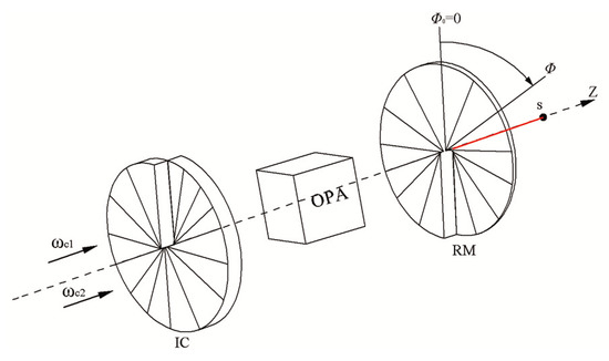 The system to be studied is shown in Figure 1, in which a degenerate OPA is placed in the L–G cavity optorotating system formed by two cavity modes and two cavity mirrors. The two cavity mirrors are the spiral phase elements [13]. The input mirror is fixed and the rear mirror is set on support S and can rotate about the Z axis. We use to represent the angle of its rotation. So we can treat the rear mirror as a harmonic oscillator with frequency , which is described by the angle and the angular momentum . The input mirror can reflect and transmit the light. It can remove the topological charge, , of the cavity mode in reflection and does not change the angular momentum in transmission. The rear mirror is considered as a completely reflecting mirror and can add the topological charge, , to the cavity mode. After a photon moves through a system one cycle, the torque exerted by the photons in the cavity on the rear mirror is given by , where c is the speed of light in vacuum and L is the length of the cavity [13].