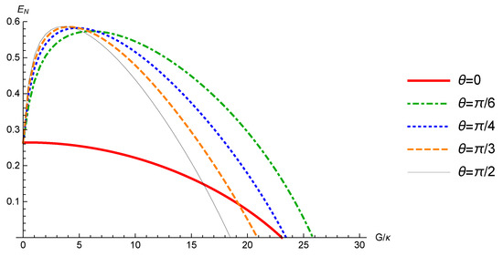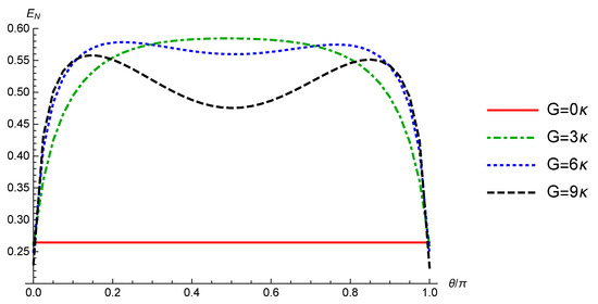 Figure 9 shows the entanglement, , of the two cavity modes as a function of the parametric phase, , of the OPA for various angular momentums of the two cavity modes. It shows that the effect of the parametric phase, , of the OPA on the entanglement, , of the two cavity modes is smaller for the larger difference between the angular momentums of the two cavity modes. For , with increasing the difference between the two angular momentums, the optimal phase, , is shifted to . When , the entanglement becomes weaker with the increasing of the difference between two angular momentums. Comparing Figure 9 with Figure 2, it can be seen that the effect of the different angular momentums on the entanglement of the two cavity modes is similar to that of the large nonlinear gain on the entanglement of the two cavity modes. The numerical calculations show that the angular momentum only influences the optomechanical coupling coefficient, , so that the effective optomechanical coupling strength, , is changed. The effective optomechanical coupling strength, , is plotted as a function of the nonlinear gain, G, for the different angular momentums of the two cavity modes, as shown in Figure 10. From Figure 10, it can be seen that increases with the increase in the nonlinear gain, G, while decreases with the increase in the nonlinear gain, G. When , the difference between and increases with a decrease in the angular momentum, , leading to the weaker entanglement between the two cavity modes shown in Figure 9.