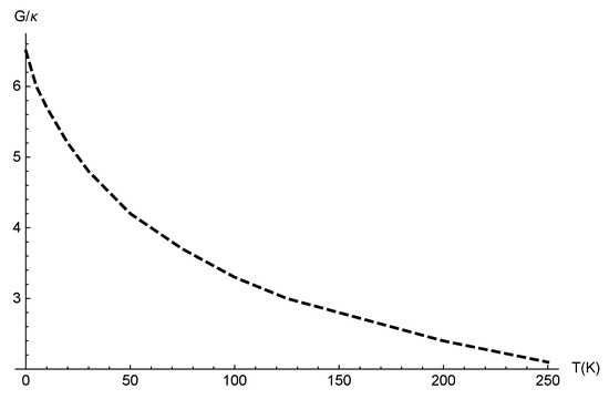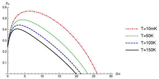 From Figure 3 and Figure 4, it is noted that the bigger nonlinear gain, G, of the OPA does not lead to the larger entanglement between the two cavity modes. Thus, there exists an optimal nonlinear gain, G, to achieve the maximum entanglement. Figure 5 plots the optimal nonlinear gain, G, for achieving the maximum entanglement as a function of the temperature, T, of the environment, where , . It is seen that the optimal nonlinear gain, G, decreases with the increase in temperature, T, of the environment. For example, when mK, 50 K, 100 K, 150 K, 200 K, 250 K, the optimal nonlinear gain, G, is , , , , , , respectively. It is seen that the entanglement can exist even at ; thus, the entanglement is robust against the temperature of the environment in the presence of the OPA.