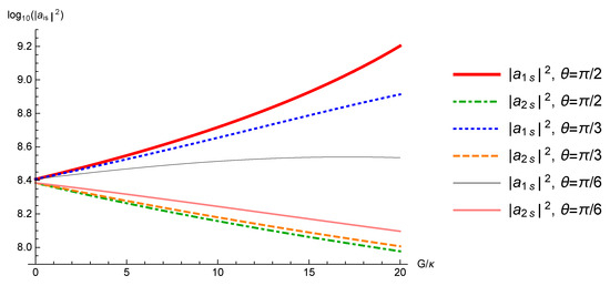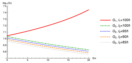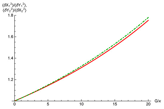 The explanation of reducing the entanglement for a larger nonlinear gain are as follows. On the one hand, the effective detuning of the two cavity modes are different (). With the increase in the nonlinear gain, G, photon number increases, while photon number decreases, as shown in Figure 6, which makes the difference between and larger for a larger nonlinear gain. This can also explain the phenomenon in Figure 3, when , the increasing of the difference between and is the fastest, so the entanglement can reach the maximum value for the lowest nonlinear gain, G, and then reduce. On the other hand, the squeezings of the two cavity modes are different for a larger nonlinear gain, and the difference between the squeezing degrees of the two cavity modes is larger with the growing of the nonlinear gain [26], as shown in Figure 7. Figure 7 shows the degree of squeezing of the two cavity modes as a function of the nonlinear gain, G, of the OPA. In this figure, we use the ratio to represent the degree of squeezing of cavity mode 1 and the ratio to represent the degree of squeezing of cavity mode 2. Without OPA (G = 0), and are equal to 1; thus, the two cavity modes 1 and 2 are not squeezed, because without OPA the cavity modes are in the thermal states [26] due to their interactions with the rotating mirror in thermal equilibrium with its surrounding environment. With the increase in the nonlinear gain, G, and increase, which shows that the OPA squeezes the phase quadrature of cavity mode 1 and the amplitude quadrature of cavity mode 2, and the degrees of squeezing for the two cavity modes are very close for a lower nonlinear gain, G, while the difference of squeezing degrees between the two cavity modes is more obvious for a higher nonlinear gain, G. For a lower nonlinear gain G, the squeezings of the two cavity modes increase the entanglement of the two cavity modes, but for a higher nonlinear gain G, the squeezings of the two cavity modes decrease the entanglement of the two cavity modes. Therefore, for a larger nonlinear gain, G, the optical noise becomes an important effective thermal bath coupled to the mechanical oscillator, giving rise to the decrease in the entanglement between the two cavity modes [26].