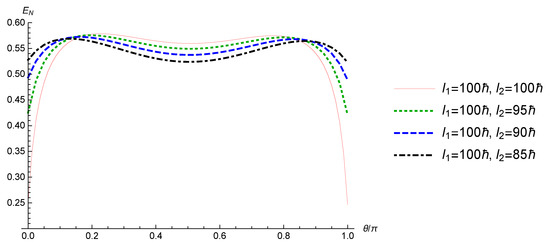 In this section, we numerically investigate the influence of the OPA on the steady-state entanglement between the two cavity modes. In order to observe the influence of the OPA obviously, we need to choose the appropriate effective cavity detunings to generate the large entanglement. Similar to [26], we set the effective detunings of the two cavity modes in the red and blue mechanical sidebands ( and ) to generate entanglement efficiently. The other parameters are given as follows [3,8,37]: the length of the cavity, L = 5 mm, the finesse of the cavity, , the mass of the rotating mirrors, ng, the radius of the rotating mirrors, R = 10 m, the resonance frequency of the rotating mirror, MHz, the effective frequency of the rotating mirror, , the quality factor of the rotating mirror, , the powers of two driven lasers, mW, mW, and the wavelengths of the two input lasers, nm. Under these conditions, we can obtain and . Thus, our system is working in the resolved sideband limit, . When cavity mode 2 is driven by a blue-detuned laser, , the entanglement between cavity mode 2 and the rotating mirror is created. When cavity mode 1 is driven by a red-detuned laser, , the quantum state of the rotating mirror is transferred to cavity mode 1. Undergoing these two processes, quantum entanglement is created between the two cavity modes. Moreover, an L–G laser beam with a topological charge value up to can be generated by using spiral phase elements experimentally [11].