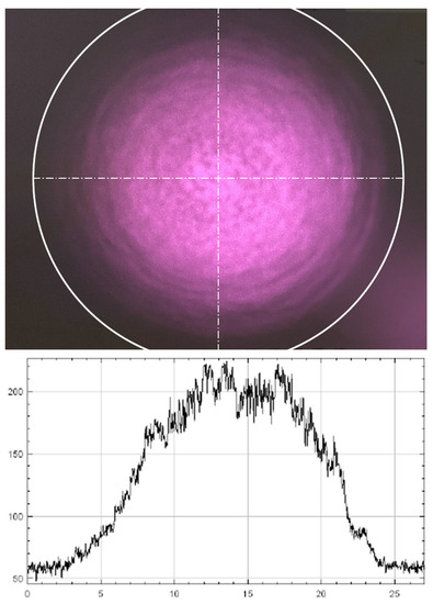 In this example, the fiber has a core of 0.105 mm and a numerical aperture of NA ~ 0.22. The image, taken at 50 cm from the fiber tip, was digitized to evaluate the intensity profile (bottom of Figure 1). The vertical scale is in arbitrary units and proportional to the laser power, whereas the horizontal scale is proportional to the spatial dimension along a central cut of the laser spot. Typically, the (x,y) centerline profile can be fitted with a super-Gaussian line shape of the type y = A exp [2(x − c)/w)]4 + b, with A being proportional to the beam power, c as the beam center position, was a measure of the beam width, and b as a constant matching the baseline background illumination of the image. Clearly, the beam intensity is non-uniform, having a maximum near the center and speckles arising from multi-mode interference.