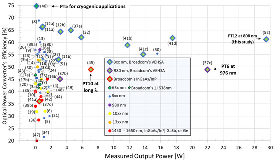 Updated Power Converter Performance Chart [41,45], including PT12 results of this study shown with data point (52). Broadcom’s vertical multi-junction data are shown with diamond-shaped symbols. Details for data points (1) to (44) are found in reference [45] or from the references herein with the matching numbers in the reference section. The descriptions for the new data points are as follow: (45) PT10 InGaAs/InP [45], (46) cryogenic PT5 [46], (47) Ge cells [47], (48) metamorphic 1J 1064 nm [48], (49) 6J 1064 nm [49], (50) 6J 808 nm [50], (51) 1J InGaAsP [51], and (52) GaAs PT12 in this study. Updated from Fafard, S. and Masson, D.P., Photonics 9, 438 (2022). Copyright 2022 Author(s), licensed under a Creative Commons Attribution (CC BY) license [45].