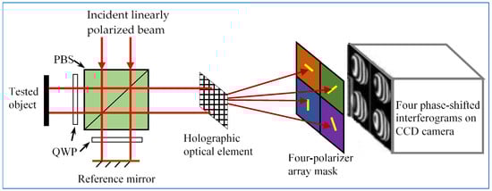 Millerd et al. [33,34] developed a SPSI based on a specially designed two-dimensional orthogonal holographic optical element (HOE) in 2001, and the optical structure diagram is shown in Figure 4. The linearly polarized beam passes through a Twyman-Green system and then is split into reference and test beams with the orthogonal linear polarization state. After passing through a HOE, the test and reference beams are diffracted into four groups; then, they pass through a four-polarizer array mask to form four phase-shifted interferograms with π/2 phase shift, which are simultaneously imaged on a CCD camera. This system optimizes the optical structure of SPSI, but the HOE used in this system cannot be used for multi-wavelength or white light interferometry, and the mask fabrication is difficult.