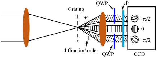 Hettwer et al. [38] used one-dimensional grating splitting, quarter wave plate (QWP) and polarizer to achieve synchronous phase-shifting, and the optical structure is shown in Figure 6. Two orthogonal linearly polarized beams pass through the grating and then are diffracted. The 0 and ±1 order of diffracted light is selected, and the QWP is inserted into an (+1, −1) order diffracted path, respectively. By adjusting QWP, three frames of phase-shifted interferograms with −π/2, 0 and π/2 phase shifts are generated simultaneously. Due to the influence of grating diffraction and wave plate transmittance, three patterns from this system have different contrast and modulation amplitude, which affects the measurement accuracy of the system. Qian et al. [39] applied simultaneous phase shifting to Mach-Zender interferometry for dynamic measurement of liquid refractive index, in which the first-order diffraction energy from the used 2D Ronchi phase grating reaches about 60% of the total incident light energy.