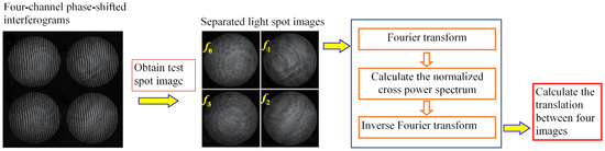 Kiire et al. [60] obtained extremely low contrast interferograms by adjusting the optical path so that the four patterns had similar gray distribution, and they used the spatial cross-correlation algorithm to determine the position matching relationship between the interferograms. Zheng et al. [22,61] used the phase correlation algorithm (PCA) for the test light spot image to obtain position registration. Its principle is similar to that of Kiire’s algorithm [43]. The only difference is that Kiire’s algorithm is a spatial domain correlation algorithm and Zheng’s algorithm [61] is a frequency domain correlation algorithm. The theoretical basis of PCA is based on the translation characteristic of 2D image Fourier transform, which means that the displacement in the spatial domain is equivalent to the phase shift in the frequency domain.