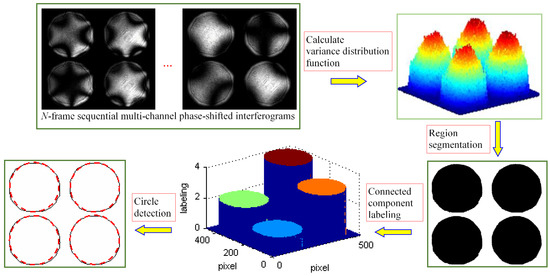 We established a self-referencing point diffraction SPSI [31], which uses a CCD camera to record four-channel phase-shifted interferograms with the phase step of π/2. The developed variance analysis method for sequential interferograms introduced statistical analysis, region segmentation and the improved Hough transform to realize position registration of circular aperture multi-channel phase-shifted interferograms [21]. The processing flowchart of the algorithm is shown in Figure 9 and included as follows.
