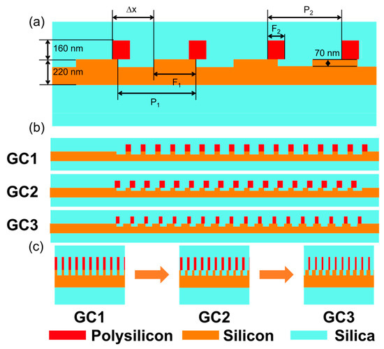 The grating coupler is designed on the standard SOI platform with a polysilicon overlay, which is available from commercial silicon photonic foundries. The thickness of the top silicon layer is 220 nm, and the thickness of the buried oxide layer is 2 μm. The raised polysilicon layer on top of the silicon has a thickness of 160 nm. As shown by the side-view schematic diagram of the grating coupler in Figure 1a, the polysilicon layer is fully etched with a 160 nm depth while the top silicon is shallowly etched with a 70 nm depth. The grating couplers proposed in this work are covered by the top oxide cladding. First, a single-layer raised polysilicon grating coupler (GC1) is designed by varying the grating periods and filling factors. Here, we define the filling factor as the ratio of the grating tooth length to the grating period. Then, a double-layer grating coupler (GC2) is designed by introducing a small displacement between the polysilicon grating teeth and the silicon grating teeth. Finding an optimal dislocation allows us to further improve the directionality. For GC2, the filling factor and the period are consistent for the polysilicon and silicon layer. It would be beneficial if the parameters of the two layers could be optimized separately. As shown by GC3 in Figure 1b, up to five parameters, including the grating displacement (Δx), filling factors (F1 and F2), and the periods (P1 and P2) of the two layers, are jointly optimized via the particle swarm optimization (PSO) algorithm. The figure of merit is defined as the coupling efficiency. Such a huge design freedom of the proposed structure allows for a significant improvement of the efficiency for a 2 μm spectral range. The complete three-step optimization process of the grating coupler is shown in Figure 1c.