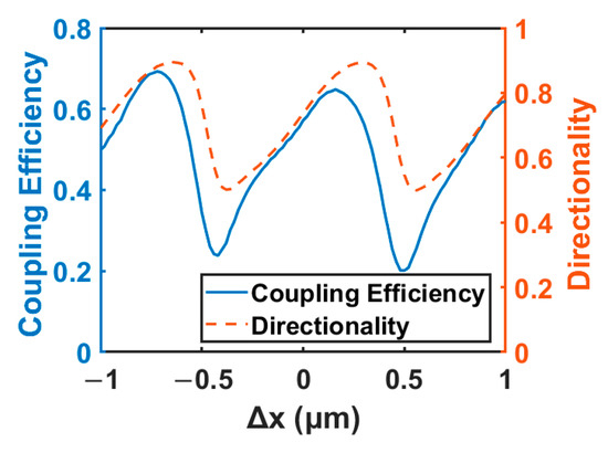 The coupling efficiency and directionality of the offset dual-layer grating coupler (GC2) as a function of Δx. It was found that the grating coupler with Δx of −720 nm achieved the highest coupling efficiency of 68.3%.
