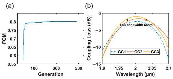 (a) The FOM of the particle swarm optimization algorithm; (b) the coupling loss of the single-layer raised polysilicon grating coupler (GC1) and the offset dual-layer grating coupler (GC2). The coupling loss and 1 dB bandwidth of the real dual-layer grating coupler (GC3).