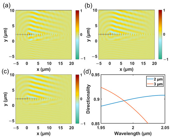 To better study the diffraction behavior of the grating coupler, the simulation area was expanded in the y-direction from −6 μm to 10 μm, and the z-component of the electric field in the grating coupler was studied. Figure 5a–c shows the z-components of the electric field distribution of GC1, GC2, and GC3, respectively. From Figure 5a, it can be seen that in the uniform single-layer grating (GC1), the light undergoes strong diffraction at the front end of the grating, resulting in an exponential decay of the diffraction field power which does not match the Gaussian mode profile of the single-mode fibers. A similar problem also appears in the mode distribution of GC2, which is actually a double-layer uniform grating. Due to the misalignment between the gratings, the effective refractive index difference at the front end of the grating is reduced, resulting in lower diffraction intensity. Therefore, it can be observed from Figure 5b that the normalized z-component of the electric field distribution does not exhibit a very obvious maximum diffraction intensity at the front end of the grating. For the PSO-optimized GC3, the size of the grating at the front end is smaller and the diffraction intensity is lower, resulting in a diffraction beam profile that matches well with the Gaussian fiber mode, consistent with a higher coupling efficiency. It is very interesting to note that the polysilicon and silicon grating layer can be designed with a completely non-uniform structure which might be able to further improve the coupling performance. However, the computation cost will be significantly higher than the GC3. In addition, from a directional perspective, due to the interference behavior between the interface reflected light and transmitted light, a buried layer with a thickness of 2 μm is not the optimal choice in the 2 μm wavelength range, which also affects the directionality of GC1. As for GC2 and GC3, which are double-layer grating couplers, their optical path length differs from that of ordinary single-layer grating couplers. In the 2 μm waveband, the directionality of GC3 with respect to the buried layer thickness is shown in Figure 5d, where there is little difference between a buried layer thickness of 2 μm and 3 μm. Furthermore, compared to a thickness of 3 μm, selecting a thickness of 2 μm for the buried layer can maintain higher directionality over a wider wavelength range, giving GC3 a larger bandwidth.