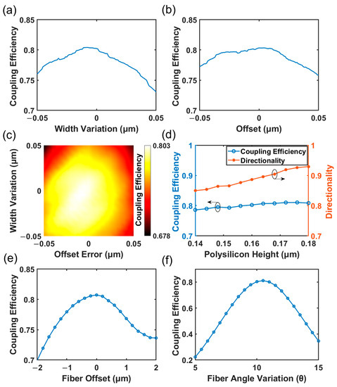 (a) Effect of width variation on the GC3 coupling efficiency; (b) effect of offset on the GC3 coupling efficiency; (c) the coupling efficiency of GC3 as a function of width variation and offset; (d) effect of the thickness of the polysilicon deposition on the GC3 coupling efficiency and directionality; (e) the relationship between the coupling efficiency of the PSO-optimized GC3 and fiber offset; and (f) the relationship between the coupling efficiency of the PSO-optimized GC3 and fiber angle variation.