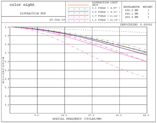 An analysis of the imaging quality of the optical system was conducted. Based on the CMOS pixel size, the modulation transfer function (MTF) of the optical system was calculated up to a spatial frequency of 45 lp/mm. Figure 3 shows the MTF curve of the system. It can be seen that when the optical system has an F-number of 2, the central field MTF is greater than 0.7 and the 0.7-field MTF is greater than 0.6, demonstrating the system’s good imaging performance.