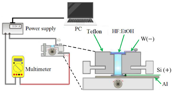PS PQS was obtained by electrochemical anodization on silicon (Si) wafers, type p+, 0.01–0.02 resistivity, (100) orientation. The Si wafer was put in a Teflon cell with an etching area of 1.1 cm2 that was used to carry out the electrochemical process; after, an aqueous solution based on 40% HF and ethanol at 99.7% with a volume relation of 1:1 was placed in the Teflon cell.