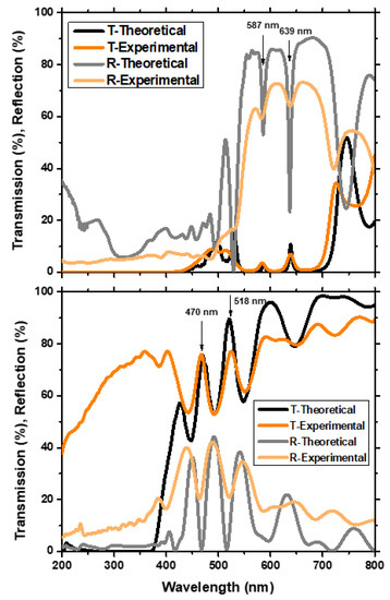 In Figure 4 (top), the PS-PQS shows two LM in the transmission and reflection spectra at 587 and 639 nm wavelengths. Theoretical and experimental results showed a good fit. Also, in Figure 4 (top), PS-PQS transmits close to 5% of the light and 10% for the first and second LM, whereas the reflected light at the same LM wavelengths is 55% and 25%. As you can see, in the UV region, the transmission and reflection are almost zero. This is due to optical losses by scattering and absorption of light in PS.