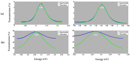 Comparison of the experimental transmission spectrum (blue line) with the theoretical transmission calculated using the Breit–Wigner’s equation modified by Miller (green line) for two LM before (a) and after (b) dry oxidation.