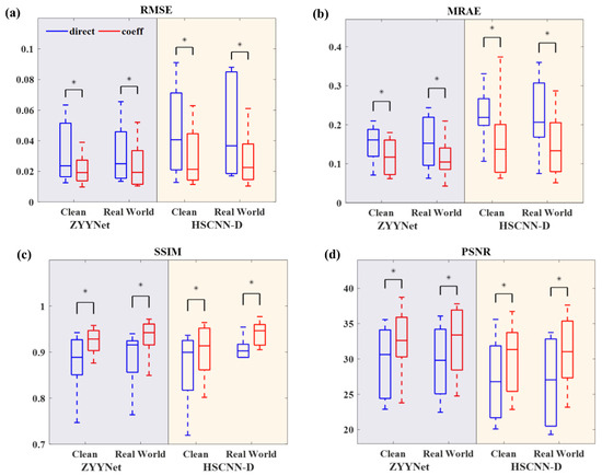 Results of statistical analysis based on the paired t-test (* p < 0.05). (a–d) the statistical analysis of RMSE, MRAE, SSIM and PSNR. The blue and red boxplots represent the results for the benchmarks with vanilla input-end (denoted as “direct”) and modified input-end (denoted as “coeff”), respectively.