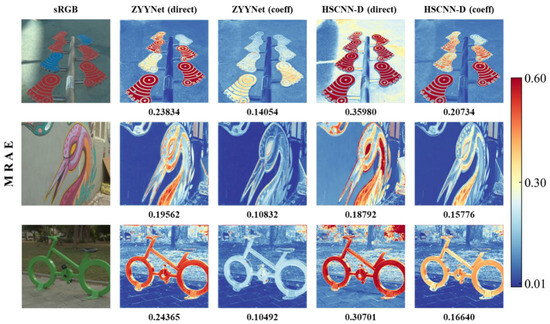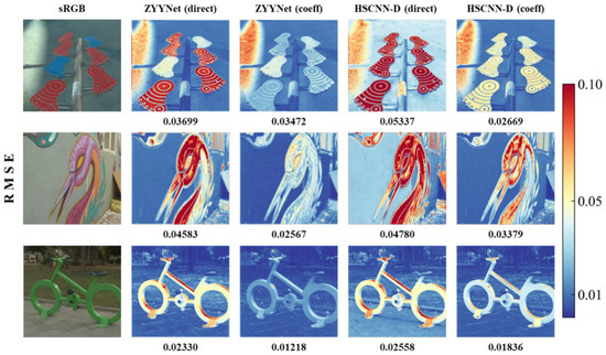 To evaluate the perceptual quality of the spectral reconstruction results, two metrics, RMSE and MRAE, are selected to draw the error maps between several recovered spectral images and their corresponding ground truths (see Figure 3 and Figure 4). The values of those two metrics all range from 0 to 1, and smaller values represent better reconstruction results (i.e., the blue parts in the error maps mean better reconstruction results). Obviously, the error maps of the “coeff” series are bluer than those of the “direct” series, no matter from the perspective of the overall or local texture. These figures demonstrate that our proposed method outperforms those benchmarks in terms of recovery results and reconstruction fidelity.
