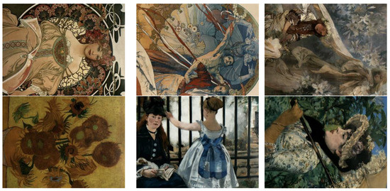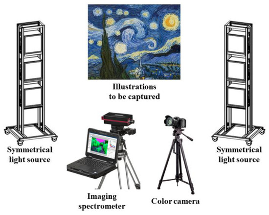 In practice, we construct a hybrid-resolution imaging system for capturing real-world spectral images along with their corresponding RGB images. Figure 5 illustrates the configuration of the imaging spectrometer (Pika L, Resonon Inc., Bozeman, MT, USA), commercial color camera (EOS 6D Mark II, Canon Inc., Kyoto, Japan), and the arrangement of the light sources employed in this system. To account for the disparity in physical location and view field between the imaging spectrometer and the commercial color camera, the SIFI algorithm is utilized to detect and match feature points, thereby achieving image registration. An illustration set is utilized as the object to be captured, and some of the registered RGB images are shown in Figure 6.