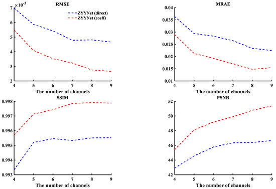 Reconstruction metrics for different numbers of channels (taking ZYYNet as an example).