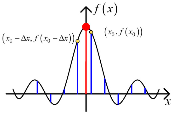 Figure 4 shows the spectral diagram of the window function, in which the highest and second-highest lines in the discrete blue line spectrum are located on both sides of the actual spectral peak. The amplitude ratio function of two adjacent spectral lines in the spectrum can be expressed by the following formula: