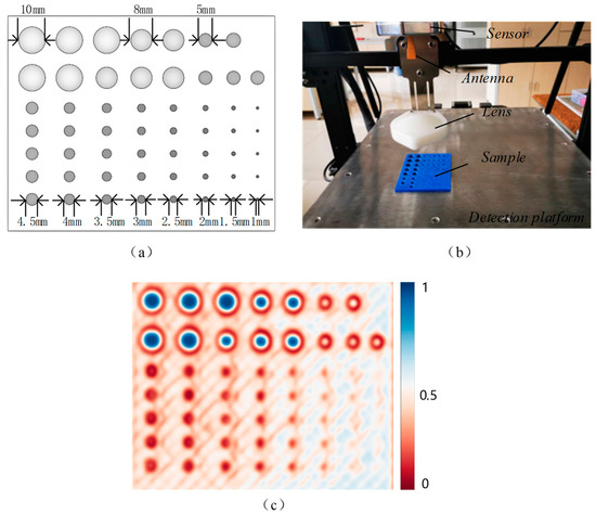 Cross-range test schematic. (a) Specimen structure. (b) System detection scheme. (c) Scanning image.