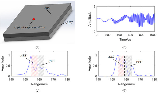 Figure 10a shows the scanning imaging results of Sample 1, which clearly reveal the pore defects in the ceramic layer. Figure 10b provides typical signal schemes of the pore defects of different depths, and analysis of the data indicates that the distances from the surface are 19.50 mm, 21.60 mm, and 24.10 mm, respectively. Figure 10c shows the scanning imaging results of Sample 2. Figure 10d provides typical signal schemes for different debonding layers. It is worth noting that in the distance dimension, the signal at the no-defect position (black line) has two peaks at around 285 mm, corresponding to glue layer 1 and glue layer 2, respectively. Thus, the debonding layer can be determined based on characteristic signal analysis. These findings provide new detection ideas and methods for the NDT of layered structures.
