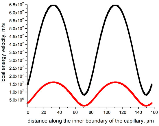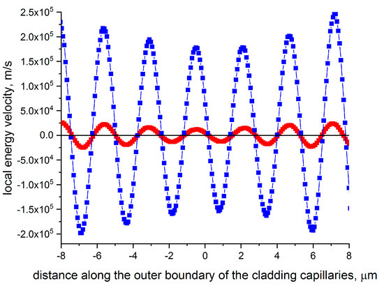 The corresponding curves are shown in Figure 5 in blue and red for the cladding capillary discussed above (Figure 2a). Figure 5 shows that the curves have a more ordered and periodic structure in the region of the cladding capillary wall closest to the center of the hollow-core fiber. The structure of the curves is not ordered and disappears in the region where the cladding capillary is attached to the supporting tube. Thus, in the regions of the cladding capillary wall where there is an ordered distribution of singularities of the transverse component of the Poynting vector of the fundamental air-core mode, the local energy velocity of the mode reaches the minimum values and, therefore, leads to the minimum leakage of the air-core mode energy. In the regions of the cladding capillary wall where there is no such structure of singularities of the Poynting vector, the radial projection of the local energy velocity and the outflow of the air-core mode energy are maximal.