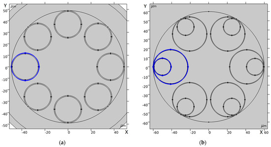 Two hollow-core fibers with a negative curvature of the core-cladding boundary made of silica glass with geometrical parameters described in the text: (a) hollow-core fiber with a cladding consisting of eight capillaries; (b) nested hollow-core fiber with very low losses at a wavelength of 1.55 μm. The blue color indicates the outer boundaries of the cladding capillaries, along which the local energy velocity distribution is considered.