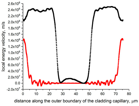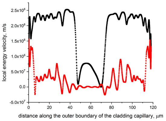 Distribution of axial (black) and radial (red) projections of the local energy velocity for the fundamental air-core mode along the outer boundary of a silica glass cladding capillary for the hollow-core fiber shown in Figure 2a in blue at λ = 1.06 μm. The distance along the abscissa axis is measured from the place where the capillary is attached to the wall of the supporting tube.