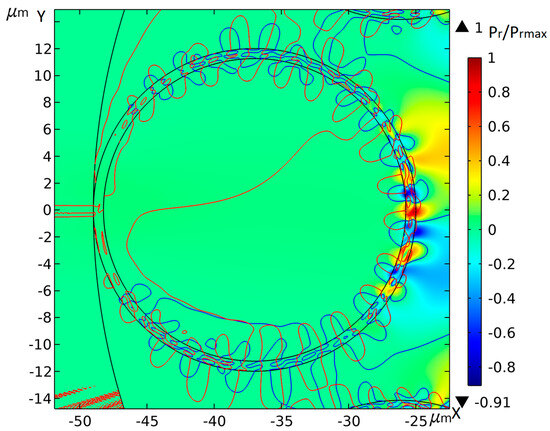 Zero level curves (blue) and (red) for the fundamental air-core mode in the cladding capillary walls of the nested hollow-core fiber (Figure 2b) at a wavelength of 2.7 μm and losses of 5.7 dB/km. The figure also shows the distribution of the radial projection of the Poynting vector of the fundamental air-core mode; the color bar to the right of the figure shows the normalized value of this projection (its ratio to the maximum value of the radial projection of the Poynting vector in the fiber cross section).
