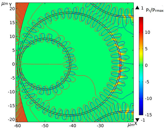 The projection distribution of the local energy velocity of the fundamental air-core mode of a nested hollow-core fiber at increased losses is qualitatively similar to the distribution of these projections for a hollow-core fiber with a cladding consisting of eight capillaries (Figure 3). Oscillations of the values of the radial projections of the local energy velocity with a large amplitude occur along a much larger segment of the cladding capillary wall than in the case of small losses (Figure 6). In addition, the segment of the capillary wall on which a significant decrease in the radial projection of the local energy velocity occurs is much smaller than in the case of small losses. All this suggests that a significant rearrangement of the structure of the singularities of the transverse component of the Poynting vector of the fundamental air-core mode should take place. This can be seen in Figure 10.