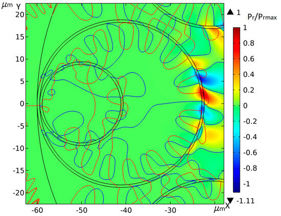 Zero level curves (blue) and (red) for the fundamental air-core mode in the cladding capillary walls of the nested hollow-core fiber (Figure 2b) at a wavelength of 1.55 μm and losses of 0.05 dB/km. The figure also shows the distribution of the radial projection of the Poynting vector of the fundamental air-core mode; the color bar to the right of the figure shows the normalized value of this projection (its ratio to the maximum value of the radial projection of the Poynting vector in the fiber cross section).