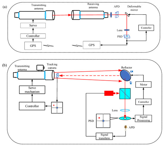 Traditional wireless optical communication systems require the transmitter and receiver to be aligned on the same boresight, and the alignment principle is shown in Figure 2a. In the wireless optical communication link, the position information of the transmitting end and the receiving end is obtained utilizing the global position system (GPS) positioning system, and the position coordinates are converted into the servo execution amount of the APT system in the pitch direction and the azimuth direction, and then it is sent to the other side through the radio frequency signal for adjustment. Before controlling the alignment of the beam, the transmitting antenna needs to be controlled to scan due to the uncertain region between the transmitting antenna and the receiving antenna. When a light spot appears on the surface of the position detector (PSD) at the receiving end, the scanning is stopped, and the position information of the light spot is fed back to the transmitting end, and the transmitting end adjusts the deflection angle of the servo mechanism according to the received signal to control the beam to complete the alignment. When disturbed by atmospheric turbulence and mechanical vibration, the method of transmitting spot position information to the transmitter is still used to control the beam for tracking. It can be seen that, in the workflow of the traditional wireless optical APT system, the sending and receiving parties need to continuously transmit position signals. When the distance of the wireless optical communication link is large, it will be affected by atmospheric turbulence in the process of signal return, which is prone to signal delay, causing the sending and receiving parties to be unable to receive the spot position information at the current moment in time, and eventually lead to the interruption of the wireless optical communication link, greatly increasing the time and uncertainty required to establish the wireless optical communication link.