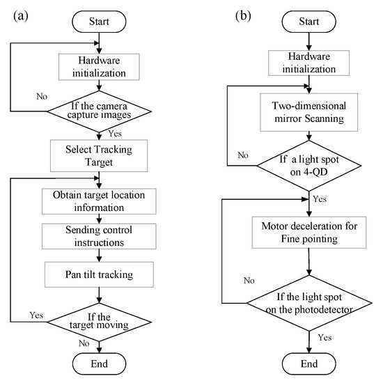 Flow chart of APT system for airborne laser communication. (a) Transmitting terminal; (b) Airborne terminal.