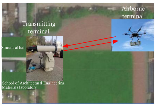 Figure 8 is a schematic diagram of the airborne laser communication field experiment. The ground transmitting end and the airborne end are located on the north side and the center of the Xi’an University of Technology playground, respectively. The experiment time is 29 May 2023. The weather is fine, the temperature is 18 °C, and the northeast wind is 3–4.