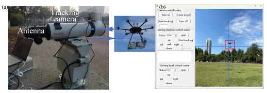 Figure 9 is a schematic diagram of calibration and coarse alignment using the camera and the pan-tilt, and the image position of the drone is used as the feedback information for adjusting the gimbal rotation. Firstly, the upper computer interface selects the UAV and the airborne terminal as calibration targets. By adjusting the deflection angle of the pan-tilt and the zoom factor of the camera, the ground pan-tilt is driven to move to keep the UAV in the center of the camera field of view, and the long-axis coarse alignment between the transmitting antenna and the two-dimensional mirror of the relay terminal is completed. After the alignment, the laser beam can cover the surfaces of the UAV and the relay terminal.