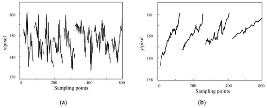 After the coarse alignment is completed, tracking is performed by calculating the pixel point deviation value between the center of mass position of the drone and the center point of the camera’s field of view. As shown in Figure 10a,b, the tracking curves in the pitch direction and azimuth direction of UAV during mobile flight are shown respectively. The longitudinal axis represents the size of pixels, and the number of breakpoints is the number of times pan-tilt adjustment. As can be seen from the figure, the azimuth was adjusted 9 times, and the pitch angle was adjusted 4 times.
