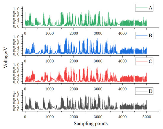 As shown in Figure 11, it is the change of the output voltage of each quadrant of the four-quadrant detector during the flight state of the UAV during take-off, movement, and hovering. It can be seen from the figure that at the 0 sampling point, the voltage values of the first and fourth quadrants are the highest, that is, after the capture is completed, the light spots fall on the first and fourth quadrants. At sampling points 50–200, after the motor decelerates and executes the fine alignment command, the voltage changes in each quadrant are relatively gentle. During the flight, the motor continuously adjusts the pitch angle and azimuth angle to complete the tracking, and the voltage value of each quadrant changes greatly at this stage; after the sampling point 3800, the UAV is in the hovering stage, and the voltage value of each quadrant changes gradually.