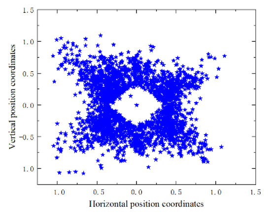 As shown in Figure 13, the spot position distribution calculated according to the voltage difference on the four-quadrant detector has a total of 6300 data points. As shown in Figure 14, since there is a hole in the center of the four-quadrant detector, there is no voltage data at the hole after alignment, so there is a hole in the middle of the spot position distribution, and the closer to the central through hole, the higher the alignment degree. After calculating the distance from the coordinates of each spot to the center of the detector, the pitch angle and azimuth angle errors of the two-dimensional mirror are obtained through calculation, and the tracking error of the system is calculated to be 13.98 µrad(3σ) according to Formula (9).