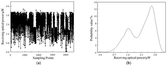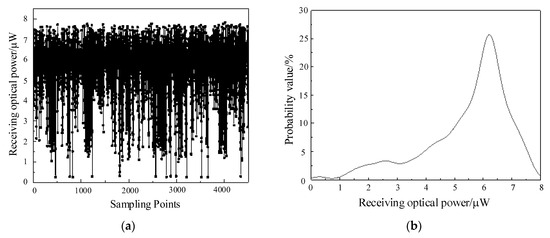 The change curve and distribution of received optical power at the airborne end of the 20 m field experiment. (a) The change curve of optical power; (b) The statistical value of optical power.