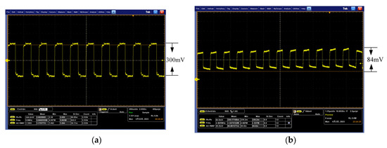 When the communication link distance is 10 m, the waveform of the transmitted signal and the waveform output by the detector at the ground end are shown in Figure 17a,b. The laser power at the transmitting end is 80 mW, the signal amplitude is 300 mV, the signal frequency is 5 MHz/s, and the waveform amplitude output by the detector is 84.0 mV.