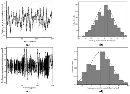 Tracking error curve of 10 m field experiment. (a) Tracking error in azimuth direction; (b) Statistical value of tracking error in azimuth direction; (c) Tracking error in pitch direction; (d) Statistical value of tracking error in pitch direction.