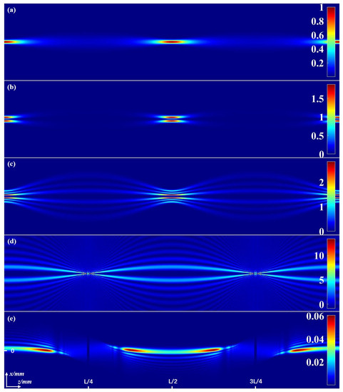 Figure 3. Illustrations of the propagation of typical structured light beams in a gradient-index medium. (a) Fundamental Gaussian beam, (b) Hermite–Gaussian beam, (c) Laguerre–Gaussian beam, (d) Bessel beam, and (e) Airy beam.