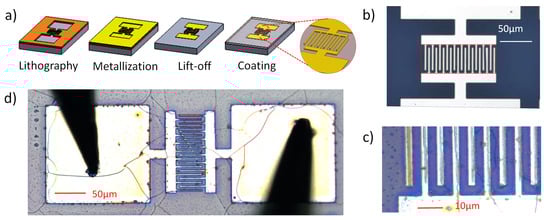 Figure 1b–d present microscopic images of the fabricated photodetectors after the liftoff (Figure 1b), after coating (Figure 1c), and during electrical measurements (Figure 1d). As observed in Figure 1c,d, the layers are homogeneous since crack density has been typically evaluated at only 1 crack every 50 µm in the region of interest. Such linear crack density between the inter-digitated electrode gives a surface crack density of 0.05 µm−2. This value demonstrates good layer uniformity compared to other works [23].