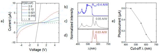 where I is the detected photocurrent, S is the detector surface (9720 µm2 indicated by the red dashed line in Figure 1b), and P is the light power density (indicated in the inset of Figure 3a). The responsivities of 0.4, 0.05, and 0.03 A/W are measured for the spectra presented in Figure 3b–d, respectively. The influence of the excitation light was also investigated using long-pass filters placed in front of the detection path, with different cut-off wavelengths ranging from 400 to 700 nm. We present in Figure 3e the detected photocurrent as a function of the cut-off wavelength of the long-pass filters at 1 V using the lamp spectra presented in Figure 3c at 0.125 W/cm2 light excitation intensity. The non-zero photocurrent detected for a cut-on wavelength at 600 nm is a signature of active sub-bandgap defects and intrinsic disorder in the Urbach tail of MAPbBr3, defects which are detected at wavelengths as long as 600 nm [31,32,33,34,37].